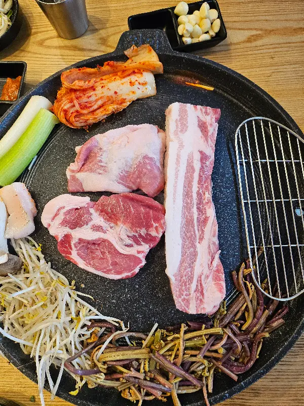 매장 안으로 들어서자 넓고 쾌적한 공간이 눈에 띄었다. 테이블 간 간격도 넓어서 편안하게 식사를 즐길 수 있을 것 같았다. 직원분들의 친절한 안내를 받으며 자리에 앉으니, 숯불이 세팅된 솥뚜껑이 떡 하니 놓여 있었다. 캬, 솥뚜껑 삼겹살이라니! 왠지 모르게 더 기대감이 솟아올랐다. 메뉴판을 다시 한번 정독한 후, 듀록 흑돼지 오겹살 2인분과 숙성 삼겹살 1인분, 그리고 김치찌개를 주문했다. 고기엔 역시 찌개가 빠질 수 없지!