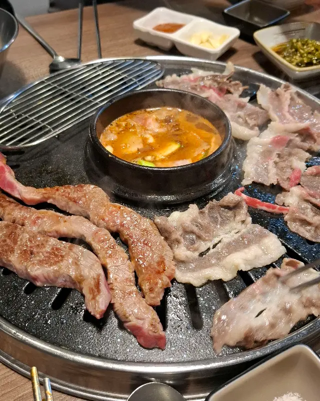 소고기 먹는 중간중간, 무한리필 차돌 된장찌개도 빼놓을 수 없지. 뜨끈하고 칼칼한 국물에 밥 말아서, 고기 한 점 올려 먹으면… 크으, 여기가 바로 천국이다. 된장찌개 안에 차돌박이도 듬뿍 들어있어서, 먹는 재미가 쏠쏠하다.