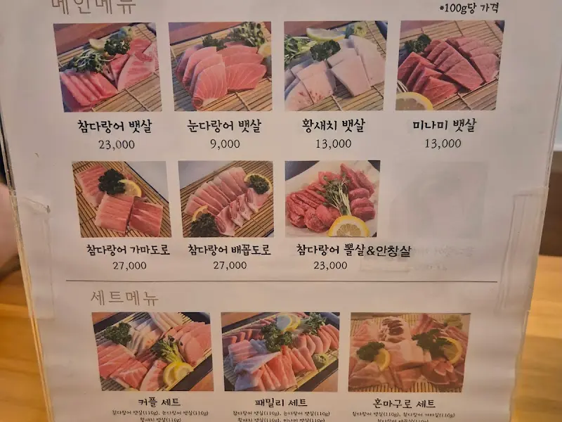 ‘최우영수산 참치’에 들어서자, 다양한 부위의 참치 사진들이 시선을 사로잡았다. 메뉴판을 펼쳐보니, 참다랑어 뱃살, 눈다랑어 뱃살, 황새치 뱃살, 미나미 뱃살 등 이름만 들어도 설레는 부위들이 가득했다. 100g 단위로 원하는 부위를 선택할 수 있다는 점이 특히 매력적이었다. 우리는 고민 끝에 참다랑어 뱃살(23,000원/100g), 눈다랑어 뱃살(9,000원/100g), 그리고 혼마구로 세트(가격 별도 문의)를 주문했다. 메뉴판에는 참치뿐만 아니라 꽃새우, 딱새우회 등 다양한 해산물도 준비되어 있었지만, 우리는 오직 참치만을 바라보며 다음을 기약하기로 했다.