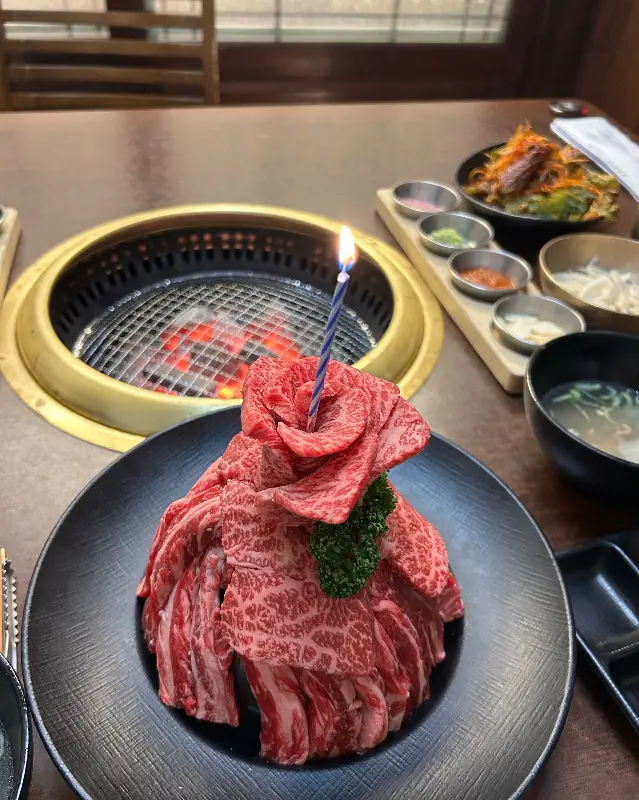예약 시간에 맞춰 도착했더니, 룸으로 안내받았어. 문을 여는 순간, 아늑하고 따뜻한 분위기가 감돌더라. 테이블 위에는 이미 깔끔하게 세팅이 되어 있었고, 직원분들이 엄청 친절하게 맞아주셨어. 이런 세심한 서비스, 진짜 감동이지. 메뉴판을 보는데, 와… 진짜 종류가 다양하더라고. 한우 등심, 살치살, 갈비살… 다 먹고 싶었지만, 오늘은 특별한 날이니까! 한우 케이크를 주문해봤어.