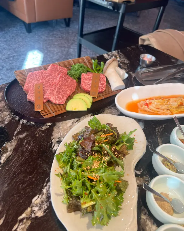 드디어 기다리고 기다리던 스페셜 모듬이 등장했습니다. 선명한 붉은 빛깔과 섬세한 마블링이 눈으로 보기에도 최상급임을 증명하는 듯했습니다. 안창살, 새우살, 살치살 등 다양한 부위가 가지런히 담겨 나왔는데, 고기마다 꽂혀있는 팻말 덕분에 어떤 부위인지 쉽게 알 수 있었습니다. 직원분께서 직접 불판에 고기를 올려 구워주셨는데, 순식간에 고소한 냄새가 코를 자극하며 식욕을 돋우었습니다.