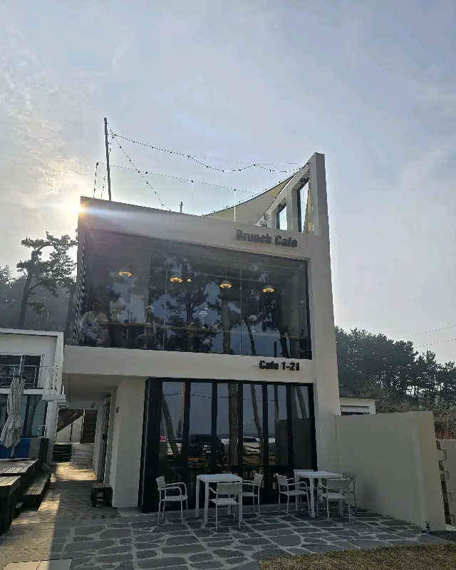 멀리서도 눈에 띄는 산포리 카페의 모던한 외관. 브런치 카페라는 간판이 설렘을 더한다.