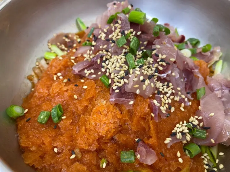 잠시 후, 드디어 기다리고 기다리던 물회가 나왔습니다. 스테인리스 그릇에 담겨 나온 물회는 보기만 해도 시원함이 느껴졌습니다. 싱싱한 회와 채 썬 오이, 배, 김 가루, 그리고 양념장이 푸짐하게 담겨 있었고, 그 위에는 깨가 듬뿍 뿌려져 있어 고소한 향이 코를 자극했습니다. 젓가락으로 살살 비비니, 살얼음이 낀 육수가 모습을 드러냈습니다.