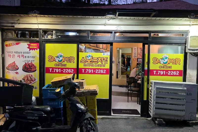 저동항에 발을 디디니, 짭짤한 바다 내음과 함께 어디선가 고소한 냄새가 코를 간지럽혔다. 노을이 뉘엿뉘엿 지기 시작할 무렵, 나는 스모프치킨을 찾아 나섰다. 가게 앞에는 배달을 기다리는 듯한 오토바이가 세워져 있었고, 간판에는 정겨운 폰트로 쓰인 “스모프치킨”이라는 글자가 눈에 띄었다. 커다란 창 너머로 보이는 주방은 분주하게 움직이고 있었다.
