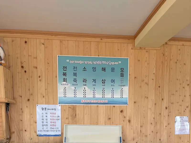 메뉴는 단출했다. 전복죽, 해삼, 소라, 멍게, 문어. 딱 봐도 싱싱함이 느껴지는 해산물들이 나를 반겼다. 혼자였기에 고민 끝에 전복죽(10,000원)과 소라(10,000원)를 주문했다. 메뉴판은 나무로 된 벽에 큼지막하게 붙어 있었는데, 손으로 직접 쓴 듯한 글씨체에서 정겨움이 느껴졌다. 사진에서 볼 수 있듯이, 가격은 비교적 저렴한 편이다. 다른 테이블에서는 모듬 해산물에 소주를 기울이는 모습도 보였다. 아, 혼자 온 게 조금 아쉬워지는 순간이었다. 다음에는 꼭 친구들과 함께 와서 푸짐하게 해산물 한 상을 즐겨봐야지.