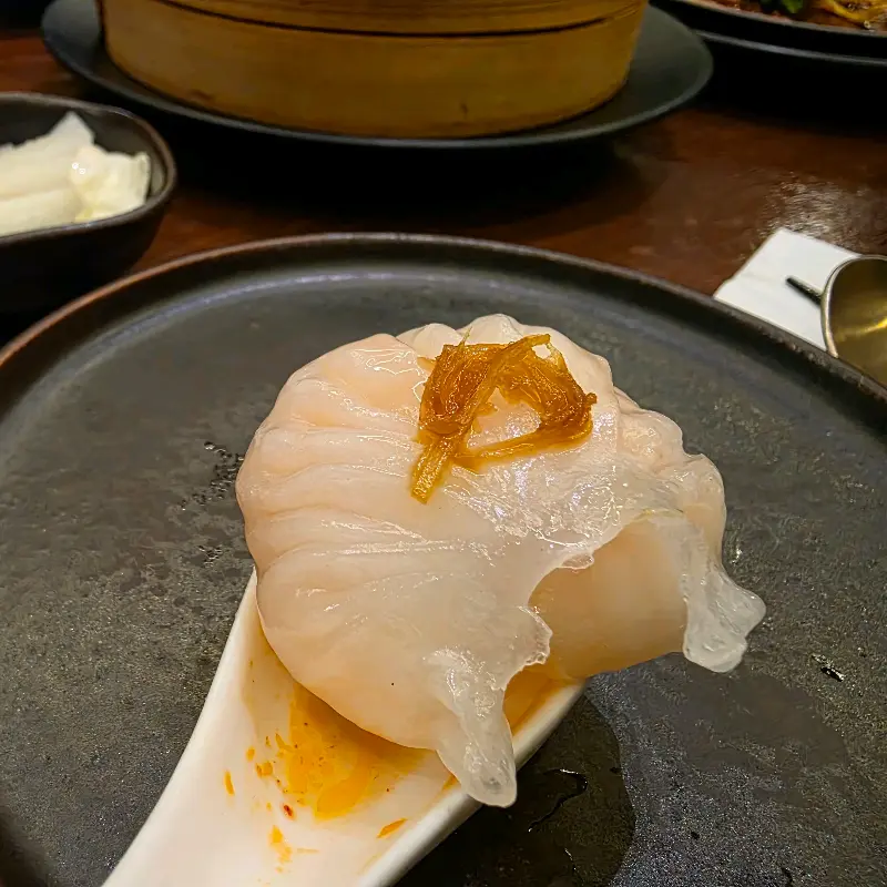 곧이어 등장한 딤섬은 비주얼부터 남달랐다. 투명한 피 안에 알록달록한 속 재료가 훤히 비치는 모습이 마치 예술 작품 같았다. 먼저 새우 딤섬을 맛봤다. 얇고 쫄깃한 피를 한 입 베어 무니, 탱글탱글한 새우 살이 입안 가득 퍼졌다. 은은한 새우 향과 육즙이 어우러져 환상적인 맛을 선사했다.