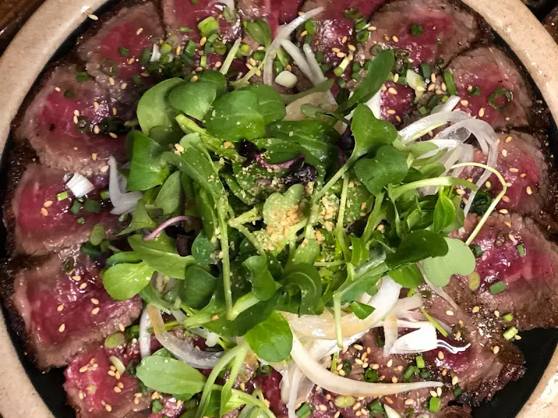 주문이 들어가자, 주방에서는 분주한 움직임이 느껴졌다. 이윽고, 기다리고 기다리던 한우 타다끼가 먼저 모습을 드러냈다. 얇게 슬라이스 된 한우는 겉은 살짝 익고 속은 촉촉한 레어 상태로, 보기만 해도 군침이 돌았다. 접시 위에는 신선한 야채와 양파 슬라이스가 곁들여져 있었고, 참깨가 솔솔 뿌려져 있어 먹음직스러움을 더했다.
