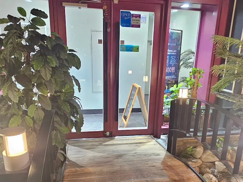 입구부터 느껴지는 갬성. 나무 데크길을 따라 은은한 조명이 비추는데, 마치 숲속 오두막으로 들어가는 기분이었다.