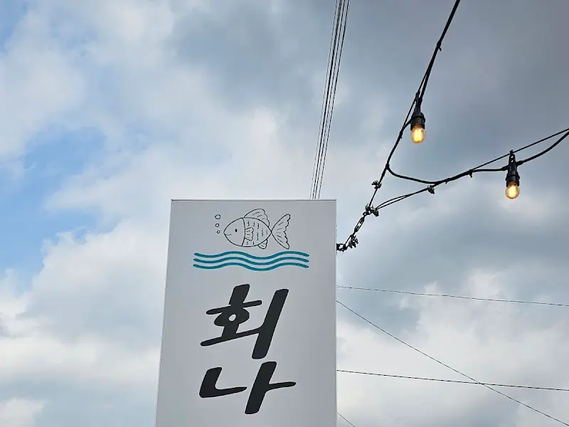 하늘 아래 빛나는 회나루의 간판. 싱싱한 물고기 그림이 눈길을 사로잡네.