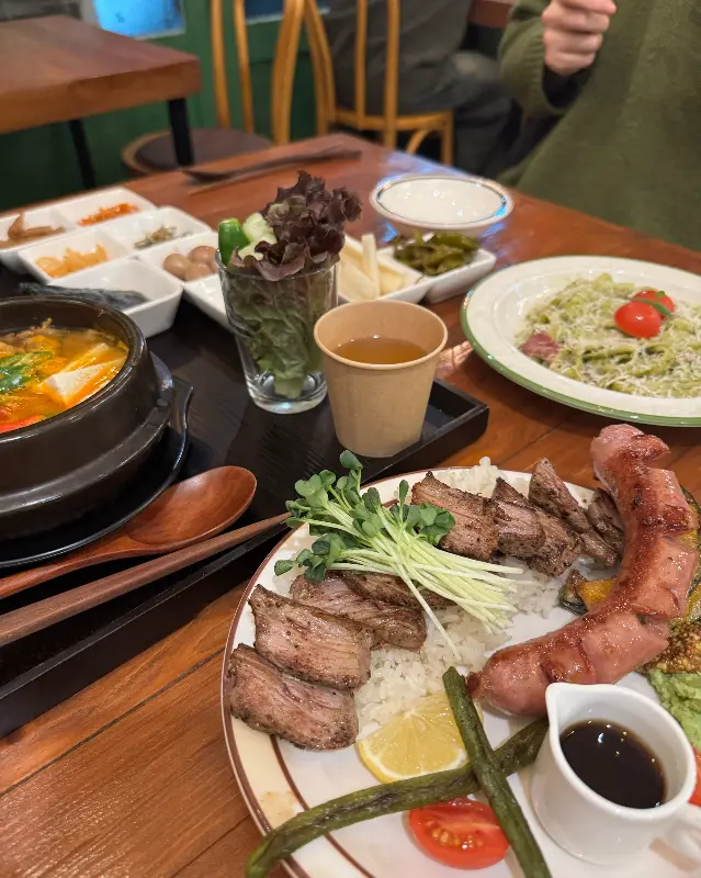 자리에 앉아 메뉴판을 펼쳐 들었다. 스테이크, 파스타, 리조또 등 다양한 메뉴들이 있었지만, 나의 레이더망에 포착된 것은 바로 ‘차돌된장찌개’였다. 놀랍게도 양식과 한식을 융합한 독특한 조합이었다. 된장찌개는 발효 과정에서 생성되는 글루타메이트 덕분에 감칠맛이 뛰어나고, 차돌박이의 지방은 고소한 풍미를 더해준다. 이 두 가지 요소가 만나 어떤 시너지 효과를 낼지 궁금해졌다. 스테이크 덮밥 역시 훌륭한 선택으로 보였다. 160도에서 마이야르 반응을 일으켜 겉은 바삭하고 속은 촉촉한 스테이크와, 고슬고슬한 밥의 조화는 상상만으로도 침샘을 자극했다. 동료 연구원들과 함께 차돌된장찌개와 스테이크 덮밥, 그리고 투움바 파스타를 주문했다.