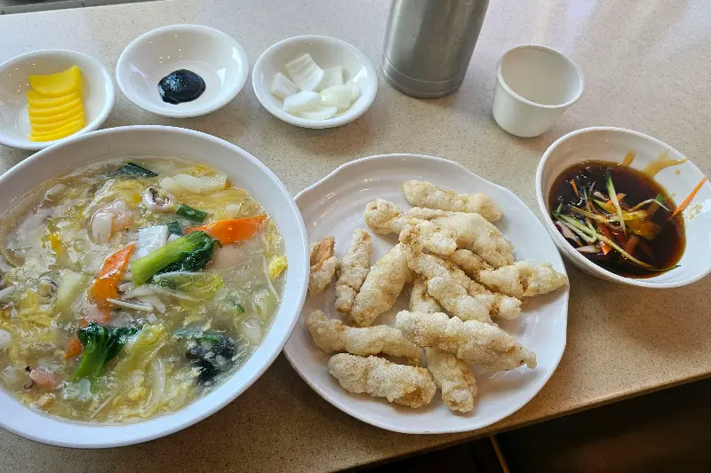 잠시 후, 드디어 기다리고 기다리던 찹쌀 탕수육이 먼저 나왔다. 뽀얀 튀김옷을 입은 탕수육은 보기만 해도 바삭함이 느껴졌다. 젓가락으로 하나를 집어 들고 소스에 콕 찍어 입안에 넣으니, 겉은 바삭하고 속은 쫄깃한 식감이 환상적이었다. 특히 탕수육 안에 들어있는 돼지고기가 정말 부드러워서 입안에서 살살 녹는 듯했다. 소스 또한 너무 달지도, 시큼하지도 않은 딱 좋은 맛이었다. 탕수육과 함께 나온 울면 역시 퀄리티가 상당히 좋았다. 면발은 쫄깃했고, 국물은 시원하면서도 깊은 맛이 느껴졌다.