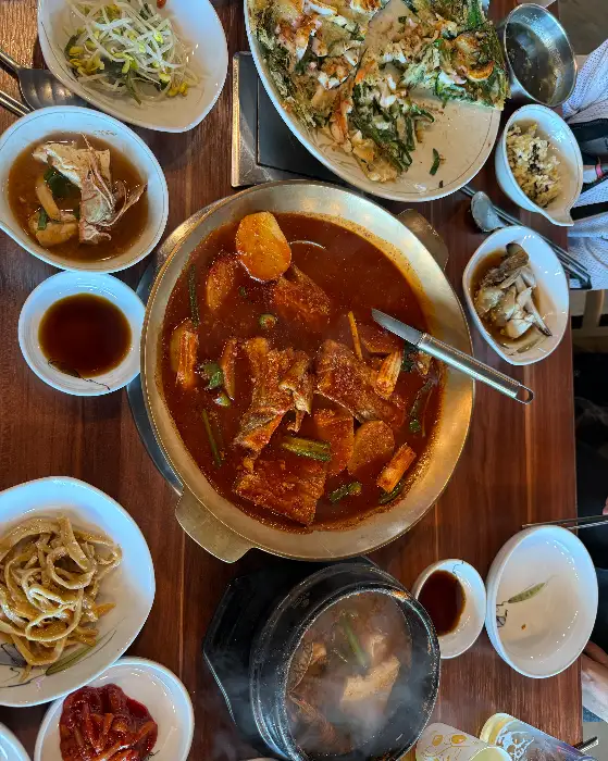눈으로 먼저 즐기는 해물탕은 그야말로 압권이었습니다. 싱싱한 전복, 싱싱한 해산물, 푸짐한 채소가 어우러진 냄비 안은 마치 바닷속 풍경을 그대로 옮겨놓은 듯했습니다. 끓기 시작하자 풍겨오는 시원한 향은 후각을 자극했습니다. 첫 국물 한 숟가락을 맛보았을 때, 그 깊고 시원한 국물 맛에 감탄하지 않을 수 없었습니다. 조미료의 인위적인 맛이 아닌, 신선한 해산물과 야채에서 우러나온 순수한 단맛과 깊이가 느껴졌습니다. 된장과 고춧가루를 베이스로 한 국물은 칼칼하면서도 깔끔한 뒷맛을 자랑하며, 계속해서 숟가락을 들게 만들었습니다.