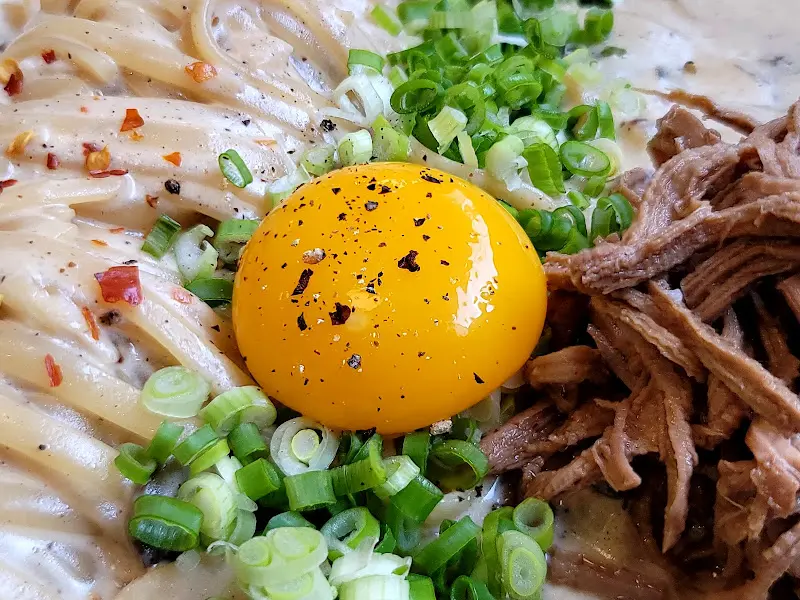 가장 먼저 나온 것은 장조림 크림 파스타였다. 따뜻한 크림소스에 버무려진 파스타 면 위로, 잘게 찢은 장조림과 신선한 쪽파가 듬뿍 올려져 있었다. 중앙에는 탐스러운 노른자가 자리 잡고 있었는데, 그 모습이 마치 예술 작품을 연상시켰다. 젓가락으로 노른자를 톡 터뜨려 면과 함께 비벼 한 입 맛보니, 입안 가득 풍미가 퍼져 나갔다. 크림의 부드러움과 장조림의 짭짤함, 그리고 쪽파의 향긋함이 절묘하게 어우러져 환상적인 밸런스를 이루었다. 특히, 장조림의 짭짤한 맛이 느끼함을 잡아주어 질리지 않고 계속 먹을 수 있었다.
