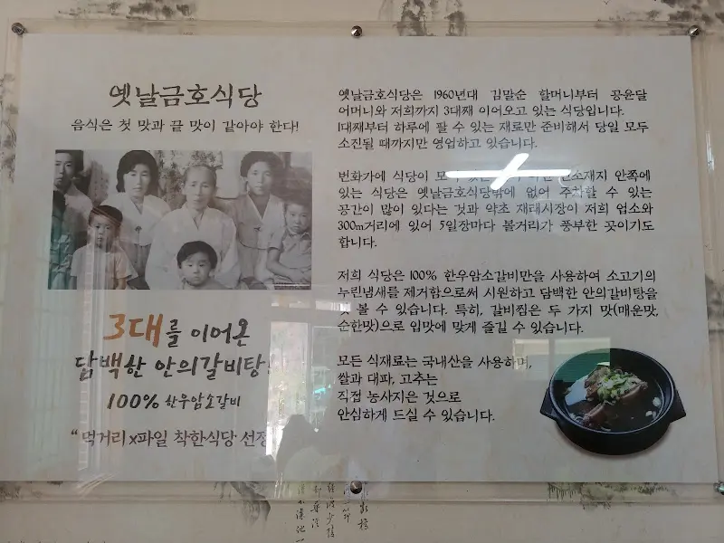 함양 땅에 발을 디딘 순간, 어릴 적 할머니 손맛이 그리워지는 건 왜일까요. 꼬불꼬불 정겨운 시골길을 따라, 마치 고향집으로 향하는 듯한 설렘을 안고 찾아간 곳은 바로 ‘옛날금호식당’이었어요. 오래된 간판에서 풍겨져 나오는 세월의 흔적은, 마치 맛있는 음식을 향한 기대를 더욱 부풀리는 듯했습니다. 함양에서 갈비찜 맛집으로 소문난 이곳, 과연 어떤 맛이 저를 기다리고 있을까요?