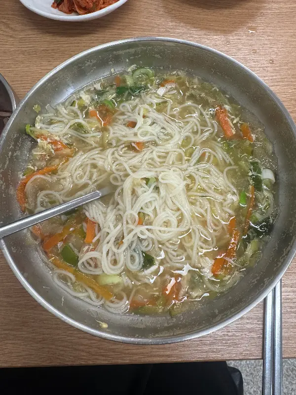 드디어 기다리고 기다리던 잔치국수가 나왔다. 커다란 스테인리스 그릇에 담겨 나온 국수는 보기만 해도 푸짐했다. 멸치육수의 은은한 향이 코를 자극했고, 그 위에는 김가루와 채소가 듬뿍 올려져 있었다. 스테인리스 그릇의 질감은 차가웠지만, 담겨있는 국수의 온기는 따뜻했다. 사진을 몇 장 찍고, 드디어 첫 젓가락을 들었다.