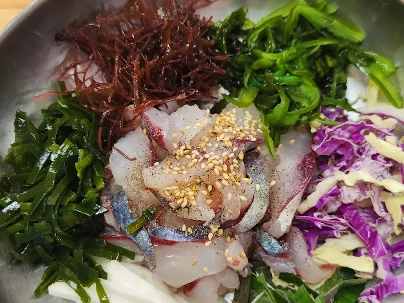 사진에서 보이는 것처럼, 신선한 보리숭어회는 윤기가 자르르 흘렀고, 그 위에는 먹음직스러운 깨가 듬뿍 뿌려져 있었다. 현미경으로 들여다보면, 보리숭어 단백질 분자들이 빛을 받아 반짝이는 것을 볼 수 있을 것 같다. 붉은색 해초, 초록색 해초, 보라색 양배추 등 다양한 색감의 채소가 조화롭게 어우러져 시각적인 즐거움을 더했다. 각각의 채소는 고유의 맛과 향을 지니고 있으며, 이는 회덮밥 전체의 풍미를 더욱 풍부하게 만들어준다.