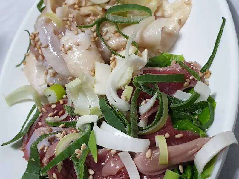 가장 먼저 닭가슴살과 닭모래집 회가 등장했다. 신선함이 생명인 닭회는 쫄깃하면서도 담백한 맛이 일품이었다. 특히 닭모래집은 사각거리는 식감이 독특했는데, 마치 아삭한 사과를 씹는 듯한 느낌과 함께 은은한 감칠맛이 느껴졌다. 쌈 채소와 함께 곁들여 먹으니 신선함이 더욱 살아났다. 솔직히 닭회는 처음 접해보는 음식이라 약간의 거부감이 있었지만, 막상 먹어보니 신선하고 고소해서 놀라웠다. 이건 꼭 알아야 한다. 닭 특유의 누린내 없이 쫄깃하고 고소한 닭회는 진솔통닭에서만 맛볼 수 있는 특별한 경험이다!