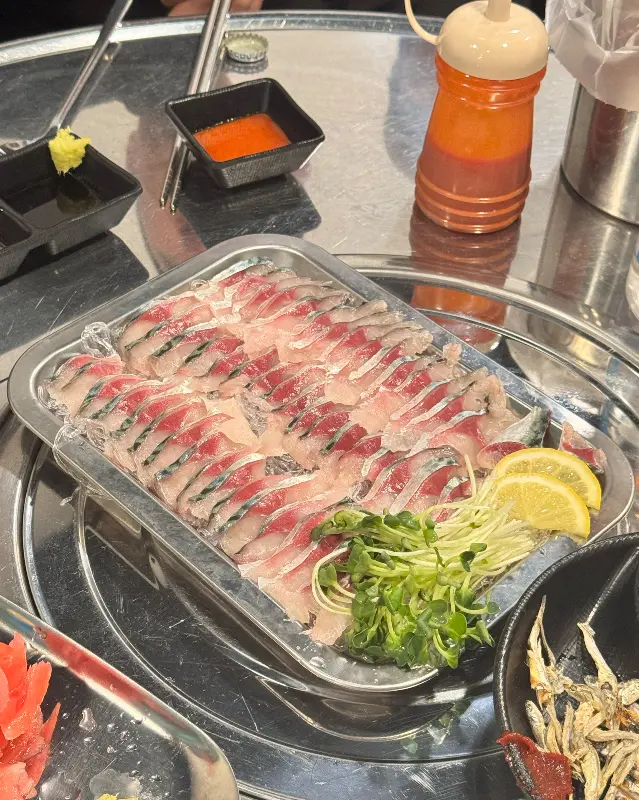 드디어 활고등어회 등장! 윤기가 좔좔 흐르는 게, 딱 봐도 싱싱함이 느껴지더라. 한 점 집어서 입에 넣는 순간… 와, 진짜 입에서 살살 녹는다는 게 이런 거구나 싶었어. 비린 맛은 하나도 없고, 고소하면서도 담백한 맛이 일품이더라. 같이 나온 깻잎에 싸서 먹으니 향긋함까지 더해져서, 진짜 꿀맛이었어.