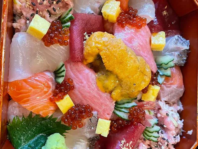 가장 먼저 등장한 것은 카이센동. 나무 상자 안에는 신선한 해산물이 형형색색의 자태를 뽐내고 있었다. 연어의 주황색, 참치의 붉은색, 성게의 노란색, 그리고 톡톡 터지는 듯한 연어알의 붉은색 향연은 시각적으로도 훌륭한 조화를 이루었다. 마치 잘 조율된 팔레트처럼, 각각의 색깔은 고유의 맛과 향을 예고하는 듯했다. 밥 위에는 다시마 간장이 살짝 뿌려져 있었는데, 이는 해산물의 풍미를 더욱 끌어올리는 역할을 했다.