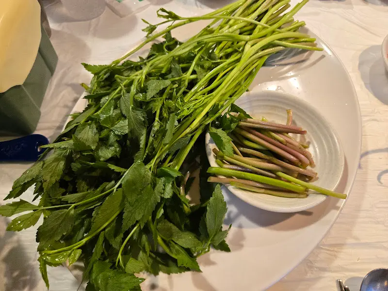 자리에 앉아 메뉴판을 펼쳐 들었다. 메뉴는 심플했다. 미나리 삼겹살이 메인이고, 미나리전과 미나리 비빔밥이 사이드로 준비되어 있었다. 고민할 것도 없이 미나리 삼겹살을 주문했다. 잠시 후, 기다리던 미나리가 푸짐하게 담긴 접시가 눈앞에 놓였다. 싱그러운 녹색의 미나리는 갓 수확한 듯 신선해 보였다. 잎은 섬세하고 줄기는 탄탄한 것이, 보기만 해도 향긋함이 느껴지는 듯했다. 곁들여 나온 밑반찬들도 하나하나 정갈했다. 특히, 직접 담근 듯한 백김치는 시원하고 깔끔한 맛이 일품이었다.