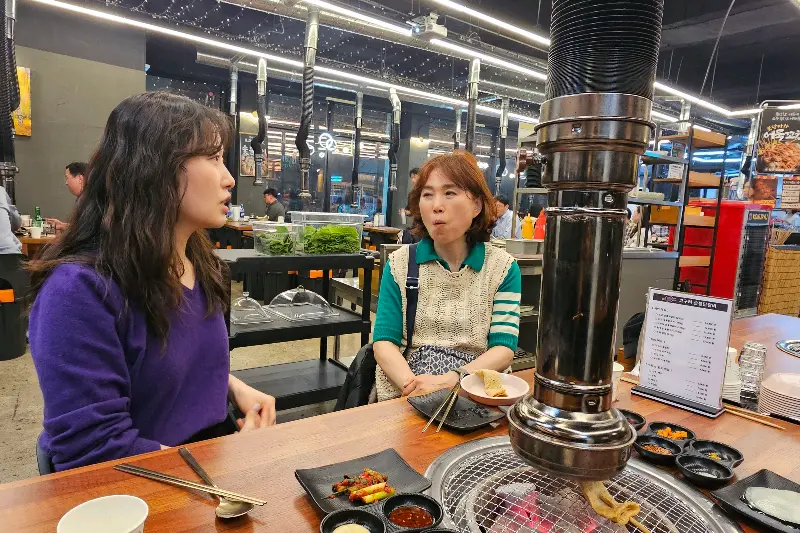숯불이 달아오르기를 기다리는 동안, 셀프바에 가서 이것저것 구경했어. 세상에나, 어묵이 무한리필이라니! 그것도 그냥 어묵이 아니라, 뜨끈한 국물에 담겨 있는 꼬치 어묵이었어. 추운 날씨에 뜨끈한 어묵 국물 한 모금 마시니, 온몸이 사르르 녹는 것 같더라. 옛날 학교 앞에서 먹던 그 맛 그대로였어. 꼬치 어묵 하나를 순식간에 해치우고, 닭갈비 먹을 준비를 마쳤지.