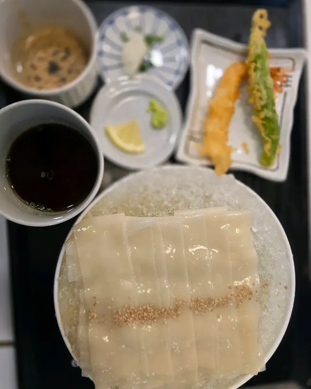 드디어 기다리고 기다리던 납작 우동이 나왔다. 넓적한 면발 위에 곱게 뿌려진 깨가 시각적인 즐거움을 더했다. 곁들여 나온 튀김은 새우와 꽈리고추로, 바삭하게 튀겨진 모습이 먹음직스러웠다. 면을 한 가닥 집어 입에 넣으니, 쫄깃하면서도 부드러운 식감이 정말 훌륭했다. 은은하게 퍼지는 유자 향은 입안을 상쾌하게 만들어주었다. 쯔유에 살짝 찍어 먹으니 감칠맛이 더욱 살아났다.
