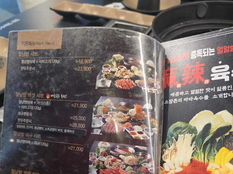 * : 메뉴판을 보면 다양한 샤브샤브 메뉴와 가격이 나와 있다. 특히 월남쌈 샤브는 16,900원부터 시작하며, 와규를 추가하면 더욱 풍성하게 즐길 수 있다. 매운 육수를 선호하는 사람들을 위해 얼큰한 맛의 마라 육수도 준비되어 있다는 점이 눈에 띈다.