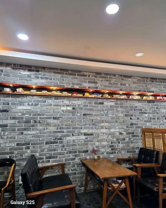내부는 생각보다 훨씬 아늑했다. 회색 벽돌 벽에는 엔틱한 찻잔들이 쪼르륵 진열되어 있는데, 그 모습이 마치 작은 박물관 같기도 했다. 나무 테이블과 낡은 듯 멋스러운 가죽 의자는 편안함을 더했고, 은은하게 켜진 조명은 공간 전체를 따뜻하게 감싸는 듯했다. 마치 시간이 멈춘 듯한, 그런 묘한 분위기가 너무 좋았다.