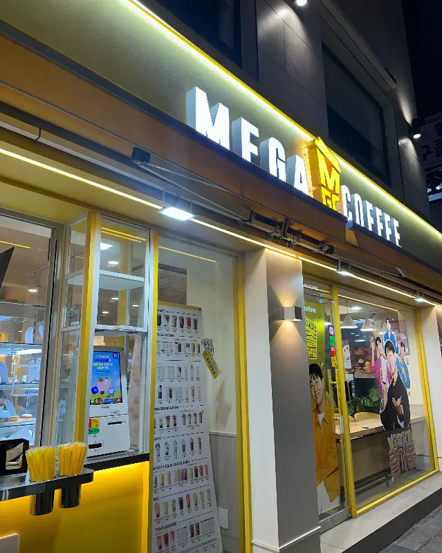 기차역에서 내려 20여 분을 걸었을까, 멀리서 노란색 간판이 눈에 들어왔다. “MEGA MGC COFFEE”라는 문구가 밝게 빛나고 있었다. 매장 앞에는 다양한 신메뉴를 소개하는 입간판이 세워져 있었는데, 군고구마 크림브륄레 슈페너라는 독특한 이름의 음료가 나의 시선을 사로잡았다. 고구마와 크림브륄레의 조합이라니, 과연 어떤 맛일까? 망설임 없이 매장 안으로 발걸음을 옮겼다.