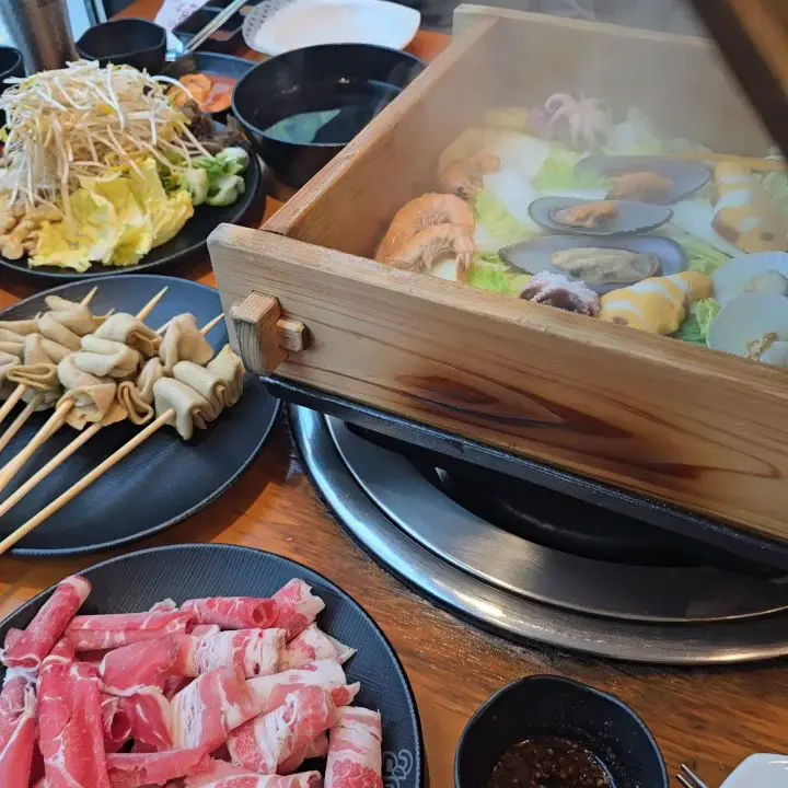 새우, 홍합, 관자, 그리고 앙증맞은 어묵까지! 재료 하나하나가 어찌나 신선해 보이는지. 특히 편백나무 향이 은은하게 배어 있어서, 그냥 보기만 해도 힐링 되는 기분이었다. 촉촉하게 쪄진 고기와 채소를 특제 소스에 콕 찍어 먹으니… 와, 이거 진짜 미쳤다! 담백하면서도 깔끔한 맛이 입안 가득 퍼지는데, 진짜 젓가락질을 멈출 수가 없었다.