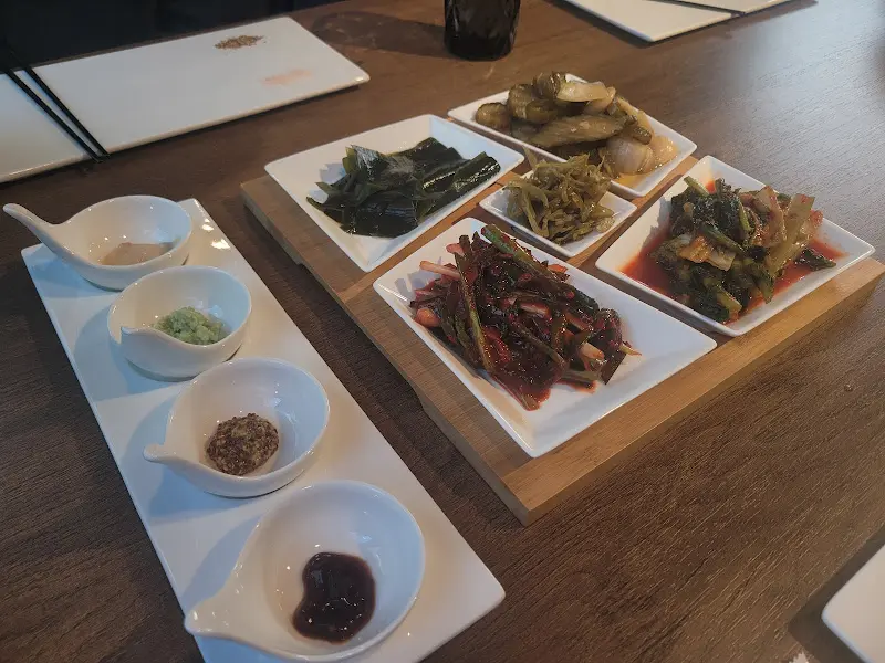 자리에 앉아 메뉴판을 펼치자, 다채로운 소고기 부위들이 나를 유혹했다. 살치살, 등심, 꽃살… 고민 끝에, 나는 그날 가장 신선하다는 살치살과 등심을 주문했다. 곧이어 테이블 위에는 정갈하게 담긴 밑반찬들이 놓였다. 형형색색의 장아찌류는 보기만 해도 입안에 침이 고이게 했고, 고기와 곁들여 먹을 다양한 소스들은 미식 경험에 대한 기대를 한껏 끌어올렸다. 사진 속 가지런히 놓인 반찬들은 그 맛깔스러운 색감만큼이나 훌륭했다.