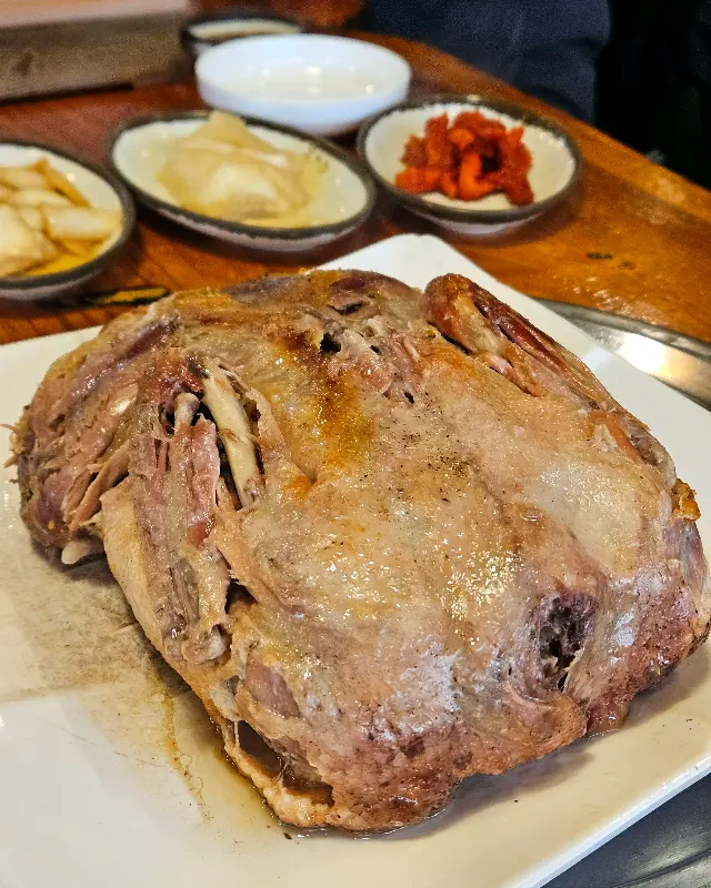 밑반찬들도 하나하나 정성이 느껴지는 맛이었어. 특히 시원한 동치미는 입안을 깔끔하게 정리해주는 역할을 톡톡히 했고, 백김치는 아삭아삭하면서도 시원한 맛이 일품이었어. 깻잎장아찌에 오리고기를 싸서 먹어도 진짜 맛있더라. 솔직히 밑반찬만으로도 밥 한 공기 뚝딱할 수 있을 정도였어.