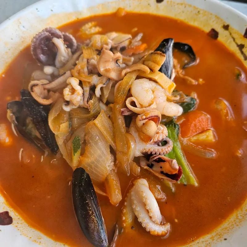 드디어 굴짬뽕이 나왔다. 뽀얀 국물 위로 큼지막한 굴들이 가득 올려져 있었고, 애호박, 양파, 당근, 목이버섯 등 다양한 채소들이 함께 어우러져 먹음직스러운 자태를 뽐냈다. 사진으로 봤을 때보다 훨씬 푸짐한 양에 감탄했다. 혼자서는 절대 다 못 먹을 것 같다는 생각이 들었지만, 왠지 모르게 남길 것 같지 않은 예감이 들었다.