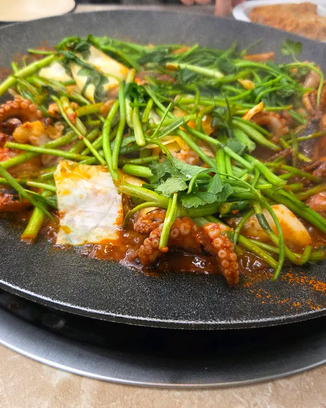 드디어 기다리고 기다리던 쭈꾸미삼겹살이 등장했어. 커다란 철판 위에 쭈꾸미, 삼겹살, 그리고 미나리가 듬뿍 올려져 있는 비주얼은 정말 예술이었지. 싱싱한 미나리의 향긋한 향이 코를 찌르면서 식욕을 자극하더라. 직원분께서 직접 철판 위에서 쭈꾸미와 삼겹살을 맛있게 볶아주셨어. 지글지글 익어가는 소리와 함께 매콤한 향이 코를 자극하는 순간, 나도 모르게 침을 꼴깍 삼켰지.