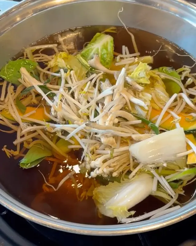 자리로 돌아오니 육수가 준비되어 있었다. 맑은 육수와 매콤한 육수 반반! 취향에 따라 골라 먹을 수 있다는 점이 마음에 쏙 들었다. 육수가 끓기 시작하자, 샐러드바에서 가져온 야채와 버섯을 듬뿍 넣었다.