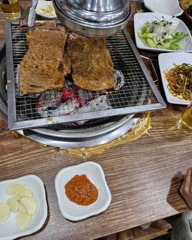 드디어 기다리고 기다리던 돼지왕갈비가 나왔다. 큼지막한 갈비 두 덩이가 숯불 위에 올려지자, 지글거리는 소리와 함께 달콤한 양념 냄새가 코를 자극했다. 참을 수 없는 식욕에 젓가락을 들 뻔했지만, 사진을 찍기 위해 잠시 멈췄다. 블로거 정신! 돼지왕갈비는 윤기가 좌르르 흐르는 비주얼부터가 남달랐다.