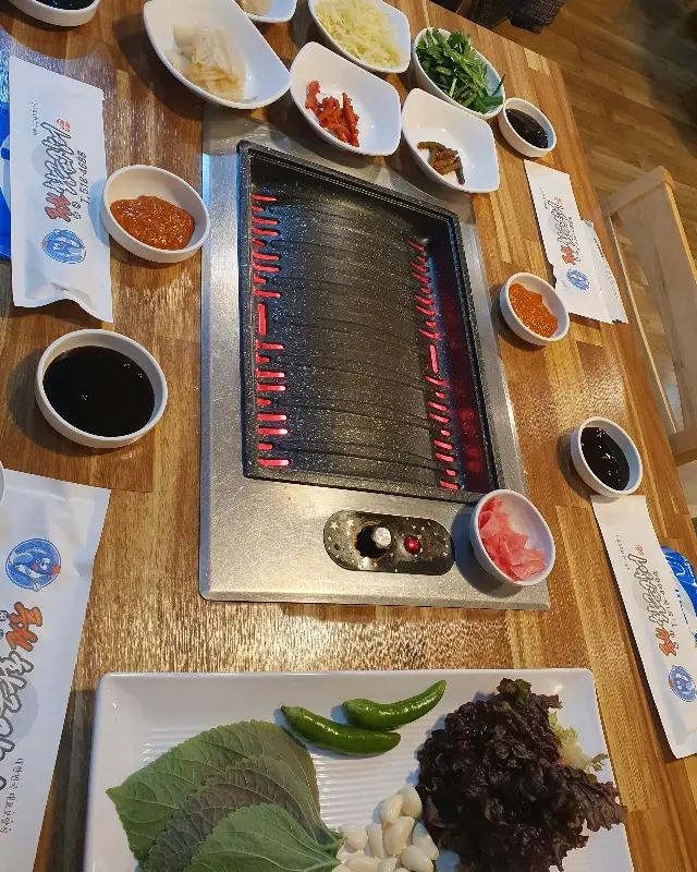 메뉴판을 보니 장어구이뿐만 아니라 장어탕, 수제비, 곰탕 등 다양한 메뉴가 있었다. 장어는 1인분 주문도 가능하다고 해서 부담 없이 장어 한 판을 주문했다. 잠시 후, 밑반찬들이 하나둘씩 테이블에 놓였다. 깻잎 장아찌, 갓김치, 쌈무 등 정갈하게 담긴 반찬들이 보기만 해도 군침이 돌았다. 특히, 깻잎을 식초물에 담가 깨끗하게 씻는다는 후기를 봤는데, 정말 신선하고 깔끔한 맛이 일품이었다. 이런 꼼꼼함이 이 집의 인기 비결이 아닐까 싶다. 게다가 밑반찬은 셀프바에서 마음껏 가져다 먹을 수 있다는 점도 마음에 들었다. 눈치 보지 않고 좋아하는 반찬을 듬뿍 먹을 수 있으니, 혼밥족에게는 더할 나위 없이 좋은 시스템이다.