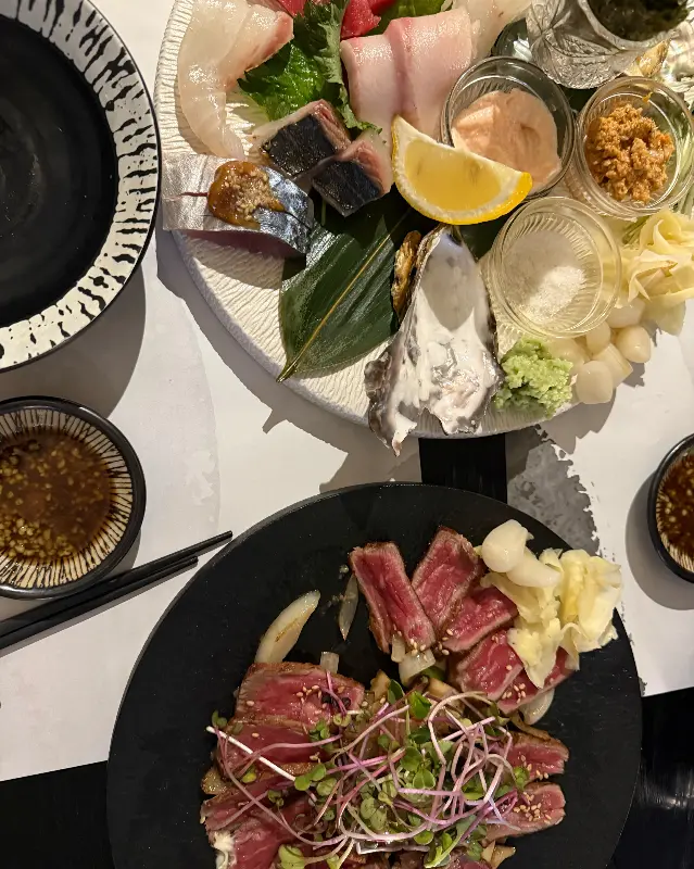 다음으로 맛본 메뉴는 소고기 타다끼. 겉은 살짝 익고 속은 촉촉한 레어 상태의 소고기가 얇게 썰어져 나왔다. 타다끼 위에는 신선한 채소와 고소한 깨가 듬뿍 뿌려져 있어, 먹음직스러운 비주얼을 자랑했다. 3번 이미지에서 보이는 것처럼, 붉은 빛깔의 소고기와 초록색 채소의 조화가 정말 보기 좋다.