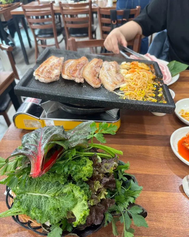 드디어 기다리고 기다리던 삼겹살이 등장했다. 큼지막하게 썰린 삼겹살은 보기만 해도 군침이 돌았다. 불판 위에 삼겹살을 올리니, 지글거리는 소리와 함께 고소한 냄새가 코를 찔렀다. 잘 익은 삼겹살 한 점을 집어 쌈 채소 위에 올리고, 쌈장과 마늘을 얹어 크게 한 쌈 싸 먹으니, 입안 가득 행복이 퍼지는 기분이었다. 신선한 쌈 채소의 아삭한 식감과 삼겹살의 고소함이 환상적인 조화를 이루었다. 역시 쌈밥은 진리다.
