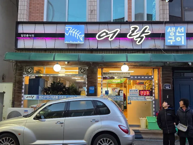시장 입구에서 멀지 않은 곳에 자리 잡은 ‘어락’은 한눈에 봐도 정겨운 분위기였다. 가게 앞에 도착하니, 파란색 간판에 흰 글씨로 쓰인 “어락”이라는 상호가 눈에 띄었다. 간판 옆에는 네온사인으로 물고기 그림이 장식되어 있어, 생선구이 전문점임을 은근히 어필하는 듯했다. 가게 앞에는 싱싱한 생선들이 담긴 수족관이 놓여 있었고, 그 위에는 메뉴판이 붙어 있었다. 메뉴판을 살펴보니 모듬구이, 갈치구이, 고등어구이 등 다양한 생선구이 메뉴들이 있었고, 가격도 부담스럽지 않았다. 혼자 왔지만, 망설임 없이 ‘모듬구이 1인분’을 주문하기로 결정했다. 혼밥 레벨 +1 상승!