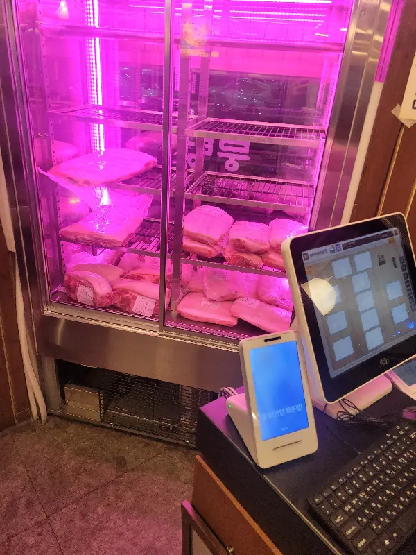 자리에 앉자마자 눈에 띈 건 고기 숙성 냉장고였다. 핑크빛 조명 아래 가지런히 놓인 고기들을 보니, 마치 보석 진열장을 보는 듯한 기분. 숙성된 고기는 얼마나 맛있을까? 기대감이 마구 샘솟았다.