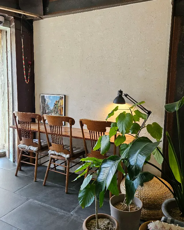카페 내부를 둘러보니, 아기자기한 소품들이 눈에 띄었다. 벽에는 드라이플라워와 그림들이 걸려 있었고, 테이블 위에는 작은 화분들이 놓여 있었다. 전체적으로 따뜻하고 편안한 분위기를 연출하는 데 신경을 쓴 것 같았다. 특히, 벽에 걸린 리스행잉 플랜트는 내 시선을 사로잡았다. 이런 작은 소품들이 카페의 분위기를 더욱 아늑하게 만들어주는 것 같았다.