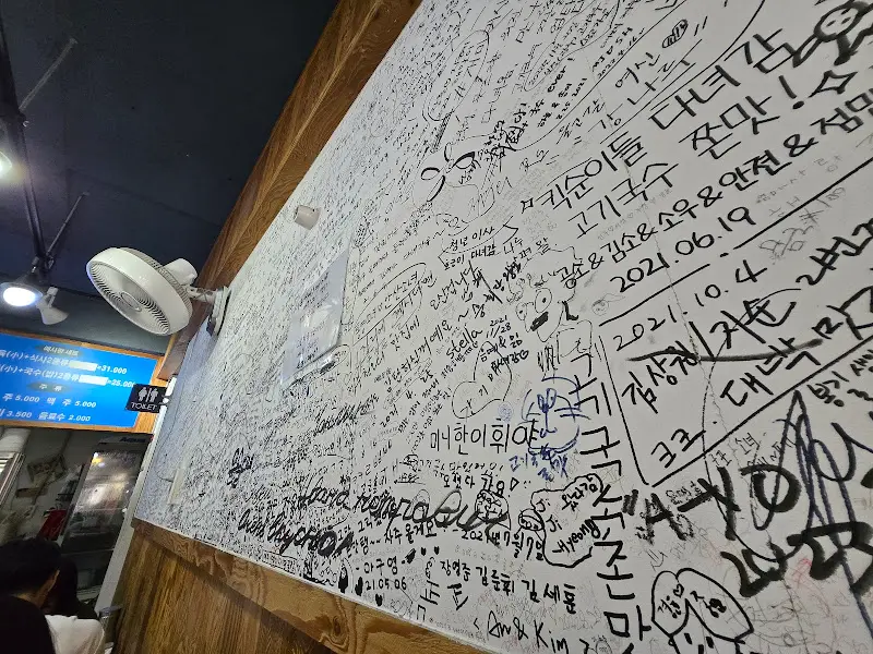 벽 한가득 채워진 손님들의 흔적, 이곳의 역사를 말해주는 듯하다.