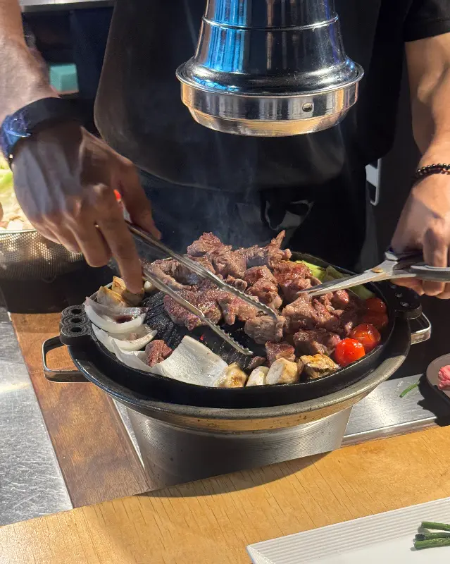 양갈비와 함께, 양파, 대파, 방울토마토, 버섯 등의 야채도 함께 나왔다. 이 모든 것을 직원분들이 직접 구워주신다니, 정말 편안하게 식사를 즐길 수 있겠다. 를 보면, 숙련된 솜씨로 양갈비를 굽는 직원분의 모습이 보인다. 연기가 테이블 위로 퍼지지 않도록 환풍 시설도 잘 갖춰져 있었다. 덕분에 옷에 냄새가 배는 걱정 없이 맛있는 양고기를 즐길 수 있었다.