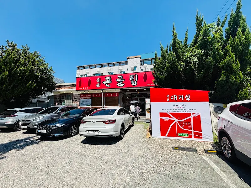 식당 앞에 도착하니 넓은 주차장이 눈에 띈다. 차를 대고 내리니, 쨍한 햇볕 아래 큼지막한 간판이 “여기 맛집이야!”라고 외치는 듯하다. 빨간색 글씨로 쓰인 ‘큰골집’ 세 글자가 멀리서도 확 띈다. 식당 입구에는 대기 공간처럼 보이는 빨간 천막이 쳐져 있는데, 왠지 정겹게 느껴진다. 평일 점심시간이 조금 지난 시간이라 그런지 다행히 대기는 없었다.