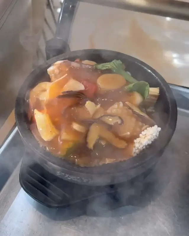 드디어 기다리고 기다리던 얼큰해물누룽지탕이 나왔다. 뚝배기에 담겨 보글보글 끓는 모습이 정말 먹음직스러웠다. 매콤한 향이 코를 자극하며 식욕을 더욱 돋우었다. 뚝배기 안에는 해물과 야채가 푸짐하게 들어 있었고, 그 위에 바삭한 누룽지가 듬뿍 올려져 있었다. 직원분께서 누룽지를 국물에 적셔서 먹으라고 친절하게 설명해주셨다.