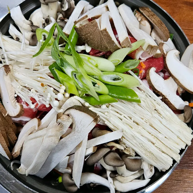 주문 후 얼마 지나지 않아, 버섯전골이 테이블 위에 놓였다. 냄비 안에는 신선한 버섯과 숙주, 차돌박이가 푸짐하게 담겨 있었다. 팽이버섯, 느타리버섯, 새송이버섯 등 다양한 종류의 버섯이 알록달록하게 담겨있는 모습이 보기만 해도 건강해지는 느낌이었다. 얇게 썰린 차돌박이의 붉은 빛깔은 식욕을 자극했다. 뽀얀 육수가 냄비 바닥에서부터 끓어오르기 시작했다. 투명한 유리 뚜껑 너머로 김이 모락모락 피어오르는 모습은 그야말로 예술이었다.