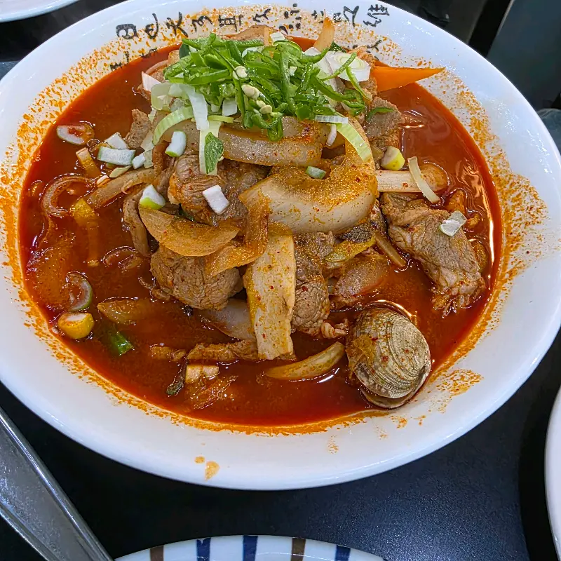 고기도 아낌없이 들어 있었다. 큼지막한 돼지고기가 듬뿍 들어있어, 면과 함께 먹으니 든든했다. 고기의 육즙이 짬뽕 국물과 어우러져 깊은 감칠맛을 더했다. 면을 어느 정도 먹고 나니, 이제 국물 맛을 제대로 즐길 차례. 숟가락으로 국물을 듬뿍 떠서 음미했다. 깊고 진한 국물 맛이 온몸을 따뜻하게 감싸는 듯했다.