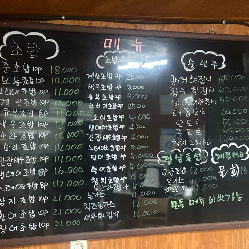 자리에 앉아 메뉴판을 펼쳐보니, 초밥 종류가 정말 다양했다. 모듬초밥, 활어초밥, 연어초밥, 참치초밥… 뭘 먹어야 할지 고민이 될 땐, 역시 그 집의 이름을 건 메뉴를 선택하는 것이 정석! 그래서 ‘준초밥’을 주문했다. 왠지 이 집의 모든 노하우가 담겨 있을 것 같은 느낌적인 느낌! 메뉴판은 칠판에 분필로 큼지막하게 쓰여 있는데, 정겨운 느낌이 물씬 풍겼다. 벽 한켠에 붙어있는 메뉴 사진들을 보니 더욱 식욕이 자극됐다.