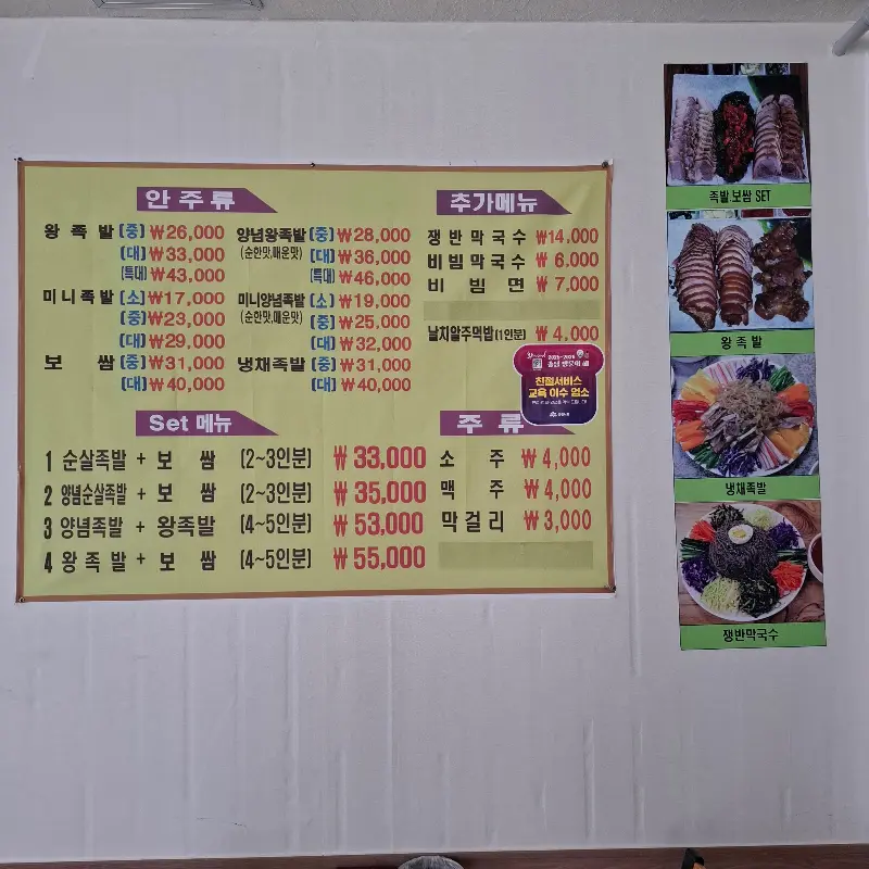 문을 열자 생각보다 넓은 매장이 눈에 들어왔다. 테이블 간 간격도 넉넉하고, 혼자 앉아도 전혀 어색하지 않은 분위기였다. 벽에 붙은 메뉴판을 살펴보니 족발, 보쌈은 물론이고 탕수육, 막국수까지 다양한 메뉴가 있었다. 혼자 왔으니 족발 대(大)자는 무리일 것 같고… 고민 끝에 미니족발(小)자를 주문했다. 혹시 1인분 주문이 가능한지 여쭤보니, 친절하게 괜찮다고 말씀해주셔서 안심했다. 역시, 혼밥은 용기가 필요하지만, 한 번 성공하면 세상 행복하다.